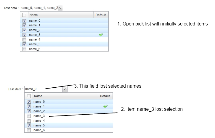 Just play around by clicking on 3th column (default) and you will see that selection is changed in field item. When close and open pick List again complete selection is buggy (see the attached picture).