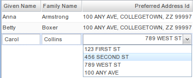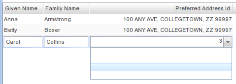 However, the underlying field for the ListGrid column is still of type INTEGER. If I use the default editor element, the edit dropdown looks like image 01: It displays the actual integer FK for the current selection, but all the dropdown elements are blank. Obviously, we need to put on a custom formatter because of the odd use case, so following the directions in the ListGridField Javadoc (rather an odd place), we set an optionDataSource on the form editor element so that it will match up the FK to the appropriate entry in the physicalAddress DataSource: