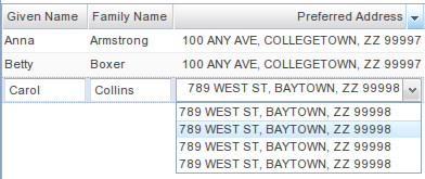 When I call getSelectedRecord, I can access the Record object for the physicalAddress that is currently assigned to the row being edited, but the dropdown needs to iterate over all the possible values for the optionDataSource. The best way would be to have the optionDataSource's Records passed in to the FormItemValueFormatter (just like a physicalAddress Record is passed in to the CellFormatter as the value), but it would also be workable to be able to call addressDataSource.getRecord(4) and retrieve the candidate address that way. I can't see a way to do either.