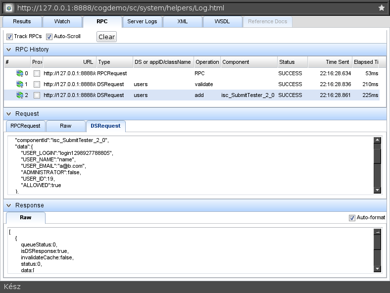 The 3rd log (which was gathered from the server) is correct, but as you can see, the DSRequest shown by the RPC manager seems to contain several fields which were definitly not given by the user (like registration IP, date and password); these were generated and added on the server side, so they could not be part of the DSRequest! My guess would be that these fields are added here from the DSResponse, but is this intended? If yes, then what's the purpose?