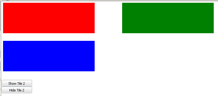 2. It is harder to maintain the order of tiles. If I could add the tiles initially hidden, I would expect that showing them would automatically make space within the layout in the order in which I added them, and vice-versa for hiding them.