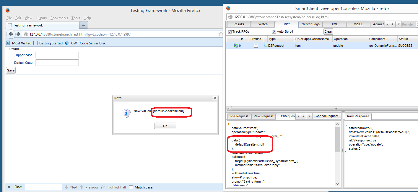 In the popup you`ll see new values from the DSRequest. You`ll notice that only defaultCaseItem and its value is included (upperCaseItem is missing).