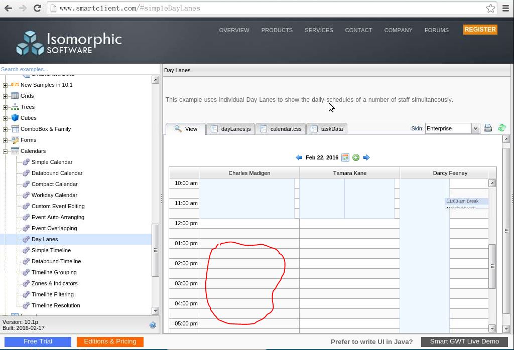 I've been running a few tests in the smart-client showcase on the various calendar objects. When accessed from a Linux platform (centOs/redhat) using either firefox or chrome, both the day and week views appear disabled (greyed out) after 10:30am on the screen. They all work fine when called from a windows OS. Any advice/feedback would be greatly appreciated. Thanks Col.