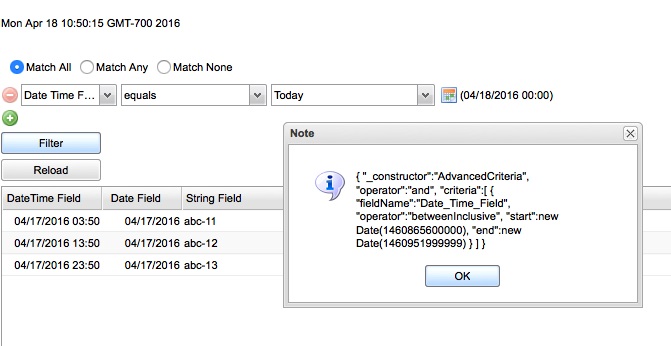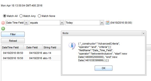 To reproduce, run server in GMT-4 timezone (America/New York), run client machine on GMT-7 (America/Los Angeles). Select DateTime filtter of equals Today, click filter.