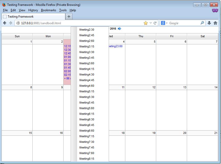 Code:package com.sandbox.client; import java.util.Date; import com.google.gwt.core.client.EntryPoint; import com.smartgwt.client.widgets.calendar.Calendar; import com.smartgwt.client.widgets.menu.Menu; @SuppressWarnings("deprecation") public class Sandbox8 implements EntryPoint { private static final String MORE_EVENTS_AUTO_CHILD_PROPERTY = "monthMoreEventsMenu"; private static Date TODAY = new Date(); private static int YEAR = TODAY.getYear(); private static int MONTH = TODAY.getMonth(); private static int START = TODAY.getDate() - TODAY.getDay(); @Override public void onModuleLoad() { Calendar calendar = initCalendar(); calendar.setWidth100(); calendar.setHeight100(); calendar.show(); addCalendarEvents(calendar); }; private Calendar initCalendar() { Calendar calendar = new Calendar(); calendar.setShowDayView(Boolean.FALSE); calendar.setShowWeekView(Boolean.FALSE); calendar.setShowAddEventButton(Boolean.FALSE); calendar.setCanCreateEvents(Boolean.FALSE); calendar.setShowDatePickerButton(Boolean.FALSE); calendar.setShowDateChooser(Boolean.FALSE); calendar.setDisableWeekends(Boolean.FALSE); Menu menuProperties = new Menu(); menuProperties.setMaxHeight(50); calendar.setAutoChildProperties(MORE_EVENTS_AUTO_CHILD_PROPERTY, menuProperties); return calendar; } private void addCalendarEvents(Calendar calendar) { for (int i = 0; i < 24; i++) { calendar.addEvent(new Date(YEAR, MONTH, START + 2, i, 15, 0), new Date(YEAR, MONTH, START + 2, i, 15, 0), "Meeting" + i + ":15", null); calendar.addEvent(new Date(YEAR, MONTH, START + 2, i, 30, 0), new Date(YEAR, MONTH, START + 2, i, 30, 0), "Meeting" + i + ":30", null); calendar.addEvent(new Date(YEAR, MONTH, START + 2, i, 45, 0), new Date(YEAR, MONTH, START + 2, i, 45, 0), "Meeting" + i + ":45", null); calendar.addEvent(new Date(YEAR, MONTH, START + 2, i, 60, 0), new Date(YEAR, MONTH, START + 2, i, 60, 0), "Meeting" + i + ":60", null); } calendar.markForRedraw(); } }
