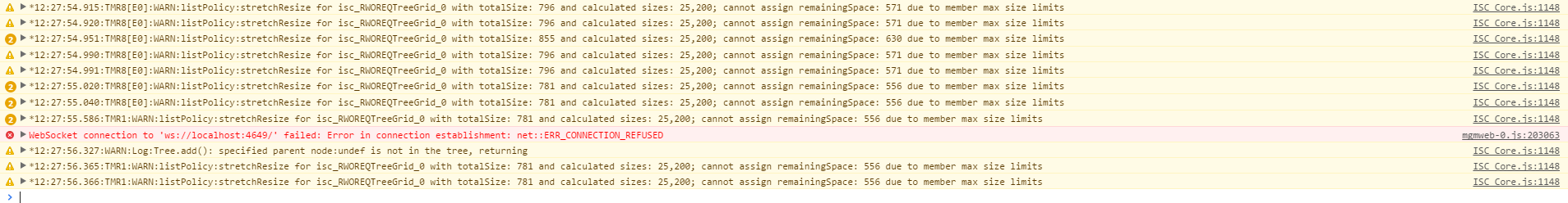 The warning I am getting in my developer console is the following: WARN:listPolicy:stretchResize for isc_RWOREQTreeGrid_0 with totalSize: 796 and calculated sizes: 25,200; cannot assign remainingSpace: 571 due to member max size limits