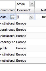The pulldowns both in editor and filterEditor have nicely sorted continents; however, I have two issues:Code:public void onModuleLoad() { final ListGrid listGrid = new ListGrid(); listGrid.setWidth(700); listGrid.setHeight(224); listGrid.setAlternateRecordStyles(true); DataSource ds = DataSource.get("worldDS"); listGrid.setDataSource(ds); listGrid.setAutoFetchData(true); listGrid.setShowFilterEditor(true); listGrid.setCanEdit(true); listGrid.setEditEvent(ListGridEditEvent.CLICK); listGrid.setCanRemoveRecords(true); [B] ComboBoxItem cbi = new ComboBoxItem("continent"); cbi.setOptionDataSource(DataSource.get("Continent")); cbi.setOptionOperationId("byName"); cbi.setDisplayField("name"); cbi.setValueField("name"); ListGridField continent = new ListGridField("continent"); continent.setFilterEditorType(cbi); continent.setEditorType(cbi); listGrid.setFields(new ListGridField("countryCode") ,new ListGridField("countryName") ,new ListGridField("capital") ,new ListGridField("government") ,continent ,new ListGridField("independence") ,new ListGridField("area") ,new ListGridField("population") ,new ListGridField("gdp") ,new ListGridField("member_g8") ); [/B] IButton newButton = new IButton("Add New"); newButton.addClickHandler(new ClickHandler() { public void onClick(ClickEvent event) { listGrid.startEditingNew(); } }); VLayout layout = new VLayout(15); layout.addMember(listGrid); layout.addMember(newButton); layout.draw(); }