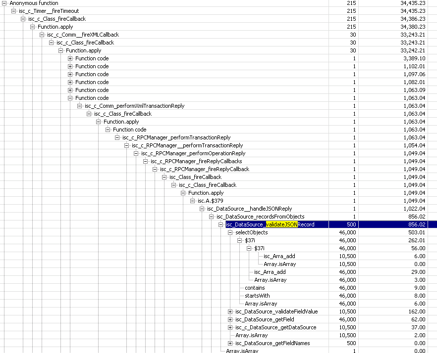 We're experiencing a significant performance degradation in IE after our roll from SmartGWT 5.0p.20151210 to 6.0p.20161023. Using the IE 11 Developer Tools Profile utility, we found that SmartGWT is spending more time in the isc_DataSource_validateJSONRecord than before. These metrics were recorded performing the same action, on both versions, with identical record counts (I've attached a picture of the call stack from 6.0p.20161023 for better context):