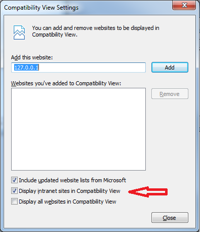 By default, our computers have Windows 7 and have the “Display intranet sites in Compatibility View” option enabled in the IE8 Compatibility View Settings (see IE8-CompatibilityViewSettings.png).