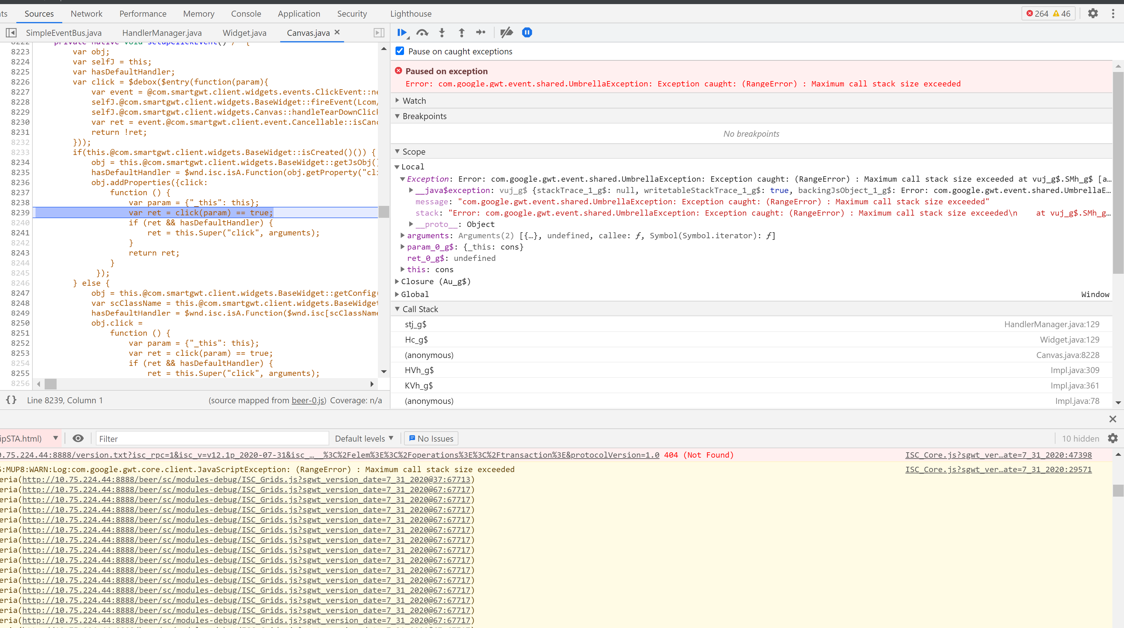 Error: com.google.gwt.event.shared.UmbrellaException: Exception caught: (RangeError) : Maximum call stack size exceeded