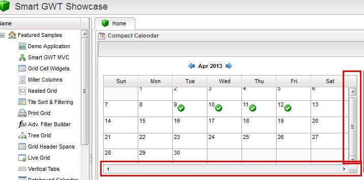 1.in the Compat Calendar example, the annoying scroll bar always shows in Firefox 20 after adding <!DOCTYPE html> in index.html, but not in IE 10。(ff20_compact_calendar.jpg and ie10_compact_calendar.jpg)