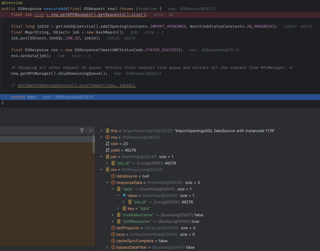getImportOpeningService().startImport(req, jobId); // Async method to continue processing import