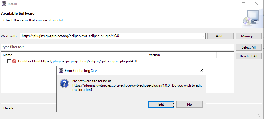 I'm unable to get the version of the GWT Plugin installed in Eclipse. Attached the error image for your reference.