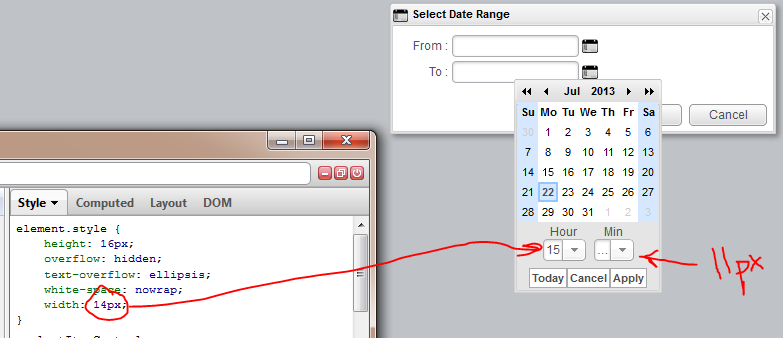 1) The DateChooser is not showing the Hour + Min drop downs properly. The drop downs themselves are too narrow and the Hour + Min text in them are being shown as ... text only. If I use FireBug or something like that and expand the width of the widget (from 11px to 15px or so) then the widget displays the text properly. I was wondering if the load_skin.js file had some new attributes or flags exposed, but was not able to see something stand out...