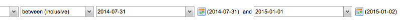 Anyway, select the between operator and select two explicit dates and then click the "Refresh" button. In my environment the Dates flip back (the problem I don't see in my application) and one of the dates (depending on your timezone) will show a different value in the input field from the display field (the problem I do see in my real application). See attached image.