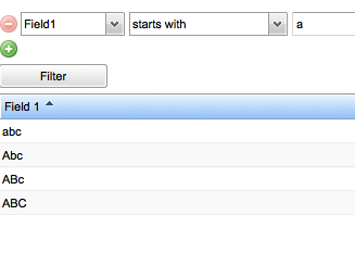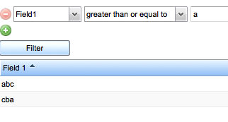 If I filter with "starts with" and value of "a", I get the 4 abc rows as expected. However if I use "greater than or equal to" with the same value of "a", I only get rows "abc" and "cba".