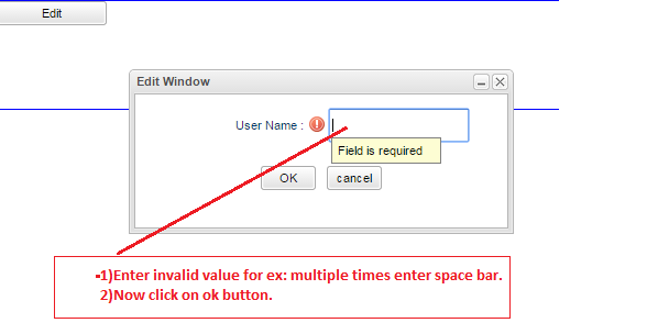 3) Now repeat step one (1) and try to validate using “OK” button. So after clicking the ok button it show “field is required” error.