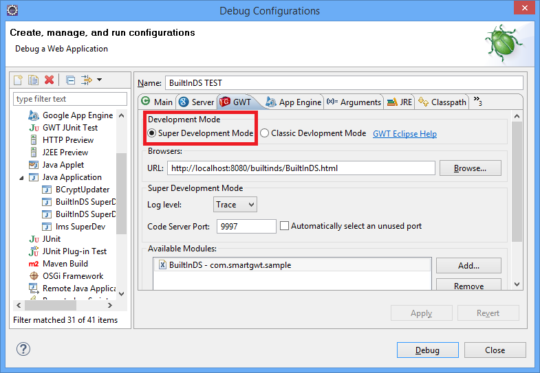 -noserver -superDevMode -codeServerPort 9997 -remoteUI "${gwt_remote_ui_server_port}:${unique_id}" -logLevel TRACE -workDir "${workspace_loc:builtinds}/codeserver" -startupUrl http://localhost:8080/builtinds/BuiltInDS.html -war "C:\Program Files\Apache Software Foundation\Tomcat 7.0\webapps\BuiltInDS" com.smartgwt.sample.BuiltInDS