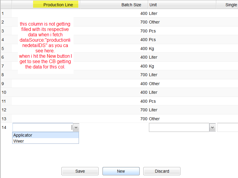 Now I have a listgrid on which I call the productionlinedetailDS file. the listgrid is filling the Combo box prfk field with appropriate data but then i want the next field to get its corresponding data "bize" but nothing happens.