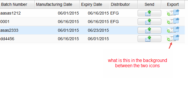 I am trying to display ImgButton in a listgrid but for some reason I see some weird thingy in between those two icons. I have attached a screenshot of it. Below is my code