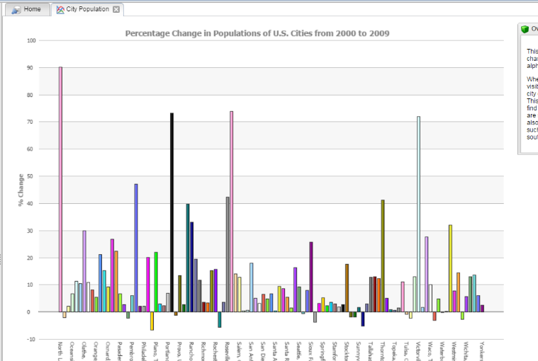 At http://www.smartclient.com/smartgwtee/showcase/#cityPopulationZoom, without adjusting the left or right panes, adjust the zoom to show Frisco, Texas (the tallest bar, it's blue) as the left most city in the upper chart. Then drag the right zoom handle to the far right to cover the rest of the cities to the right of Frisco.