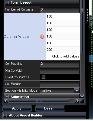 <DynamicForm numCols="6" .... colWidths="150,150,100,150,150,200">