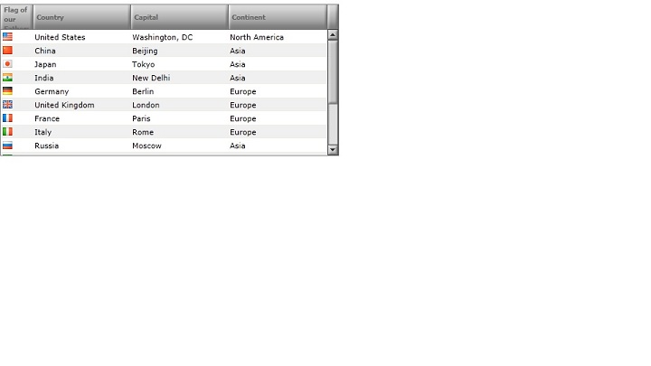 isc.ListGrid.create({    ID: "countryList",    headerHeight:36,     autoSize:true,        headerButtonProperties:{            wrap:true},    width:500, height:224, alternateRecordStyles:true,    data: countryData,    fields:[        {name:"countryCode", overflow:"visible", title:"Flag of our Fathers", width:"8%", type:"image", imageURLPrefix:"flags/16/", imageURLSuffix:".png"},        {name:"countryName", title:"Country"},        {name:"capital", title:"Capital"},        {name:"continent", title:"Continent"}    ],    canResizeFields: true})