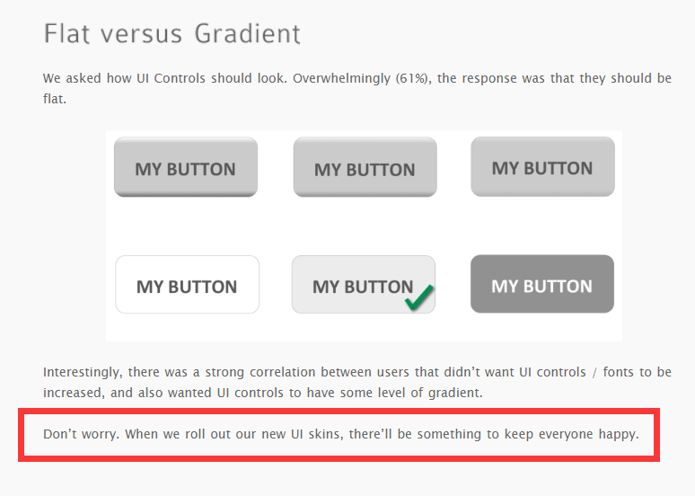 We asked how UI Controls should look. Overwhelmingly (61%), the response was that they should be flat. Interestingly, there was a strong correlation between users that didn’t want UI controls / fonts to be increased, and also wanted UI controls to have some level of gradient.