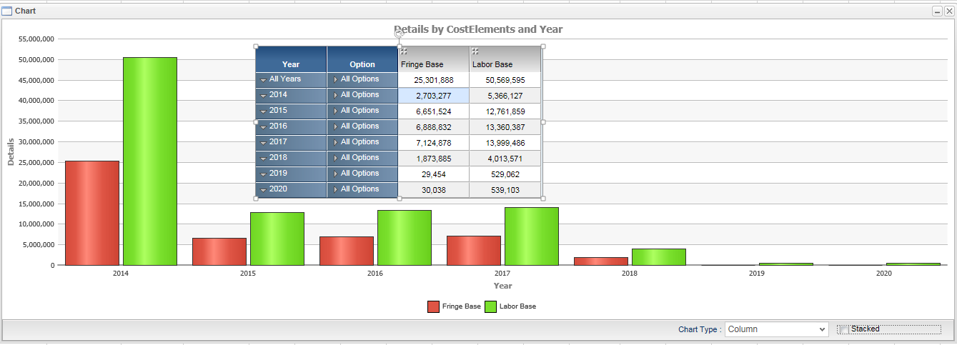 I have Year/Option as 2 rowFacets and FringeBase,Labor Base as Column facets.