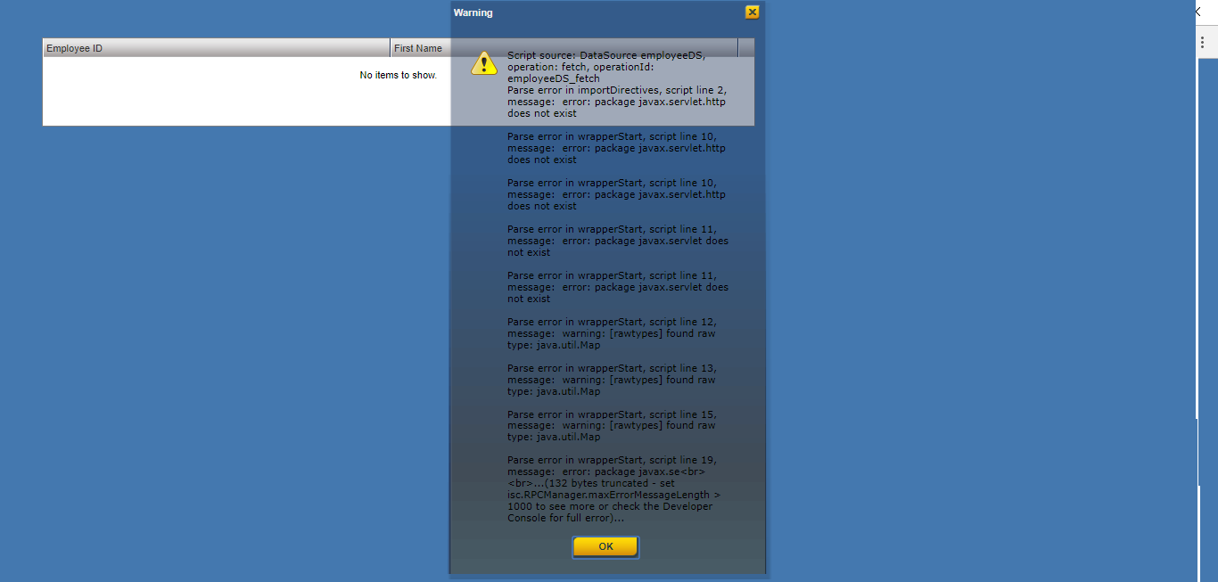 I'm getting an error when trying to do basic server scripting with the Java language. I get the error shown in the attached image file when I perform a fetch on a grid that uses my data source. The data source has the following definition: