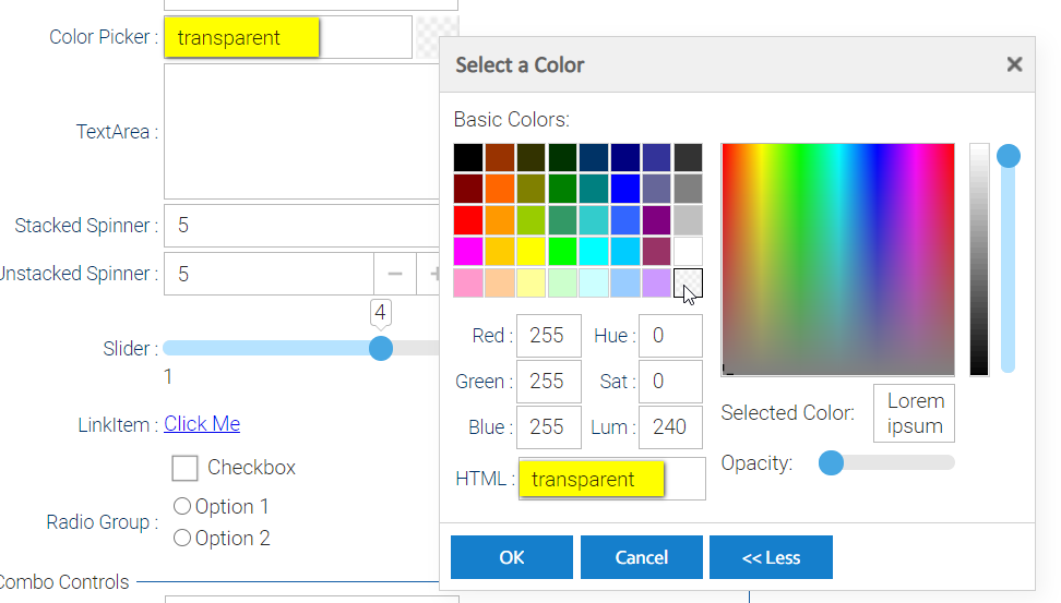 I need to replace the text "transparent" which appears in a ColorItem and ColorPicker with some alternative text.