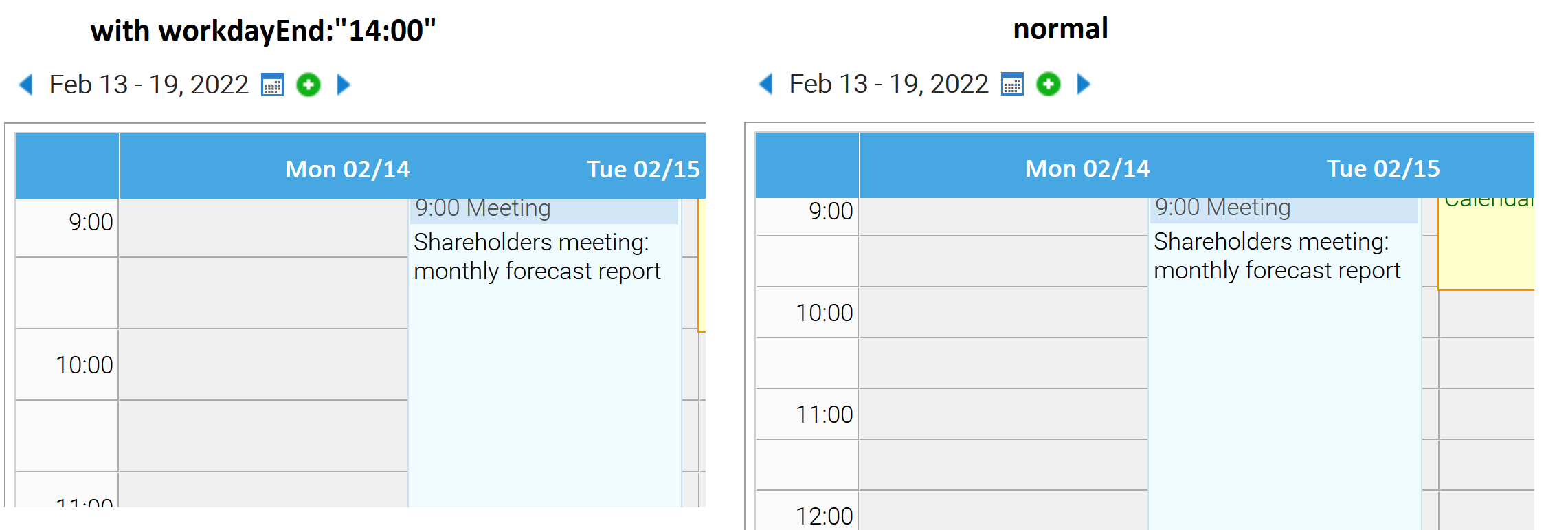 please see this sample (v12.0p_2022-02-12, here for v13.0p_2022-02-13) and add workdayEnd:"14:00". You'll see that the cell height of the 30min-slots severely increases. This is unexpected.