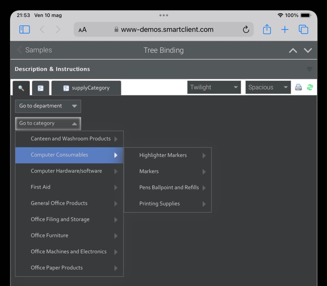 Hello, while trying the sample https://www-demos.smartclient.com/sm...&skin=Twilight with an iPad, I found that it's really really difficult to scroll the menu when it doesn't fit on screen (Go to category -> General Office Products).