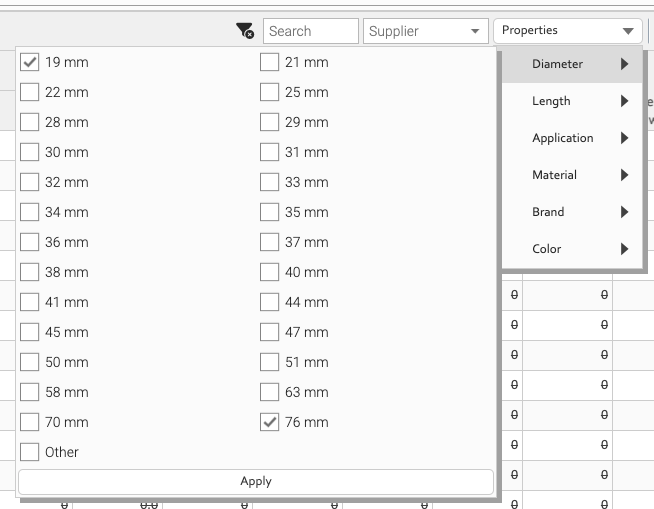 // propertiesMenuButton.getValues() is custom made and returns something like { diameter: [19, 76] }.