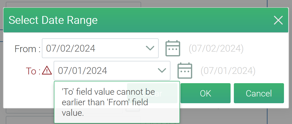 The validation happens on OK click, so one can select dates in whatever order.