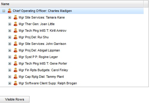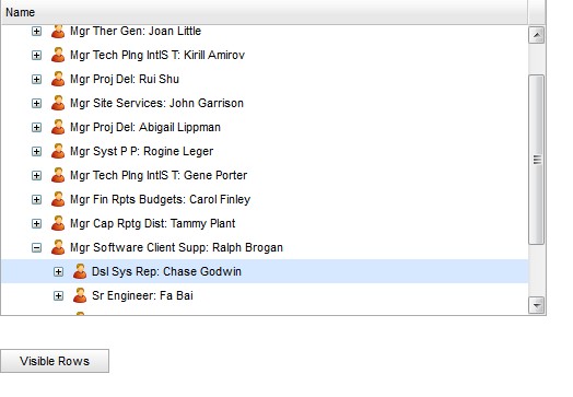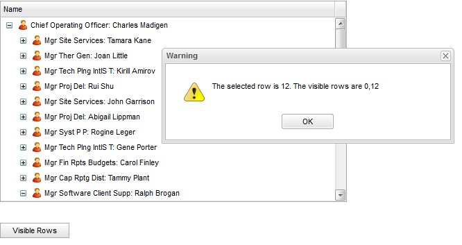 3. Scroll up to the top of the tree. Click the "Visible Rows" button. It shows that the selected row is 12 (Chase Godwin) and the visible rows by calling TreeGrid.getVisibleRows() are [0, 12]. However, the selected record (Chase Godwin) is not visible to the user. (VisibleRecord3.jpg)