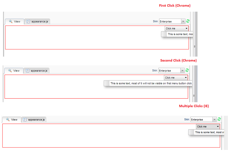 I have a menu which opens on the far right side of screen. When that menu has a menuItem with a dynamic title, the width of that menu seems to be correct but a part of the menu is off screen. In Chrome this issue seems to correct itself when you open the menu for a second time (given that the dynamic title isn't any longer). In Internet Explorer the second click doesn't make a difference. Please see code example which works in SC feature explorer sandbox, and screenshot.