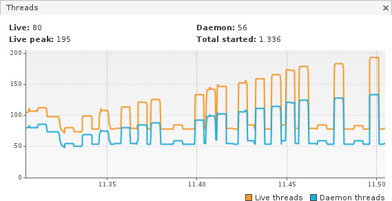 But, using visualvm, I see peaks in the number of activemq threads, peaks which, strangely enough, gets higher every time a single push operation is invoked.