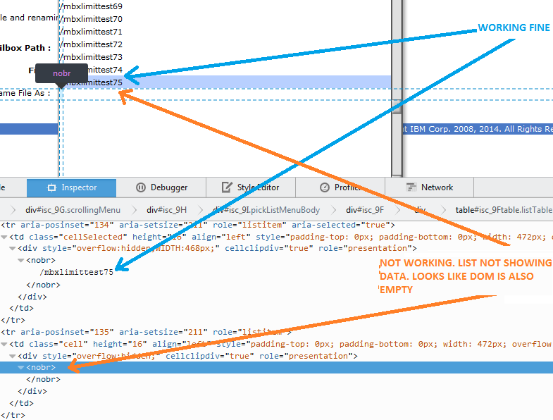 I have attached the screenshot that shows that data is not getting populated under <nobr> after the 75th element in the drop down, it simply continues to create such empty tr > td >nobr tags after 75 or so.