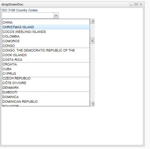 var provData = new Array(); for (var i = 0; i<2000; i++) { var value = "DEFAULT"; if (i%13 == 0) value = "EXPAND THE STRING TO A LONG ONE TO SEE"; else if (i%11 == 0) value = "EXPAND THE STRING TO HELLOW WORLD "; else if (i%7 == 0) value = "EXPAND THE STRING TO BBB"; else if (i%5 == 0) value = "YELLOW STRAWBERRY"; else if (i%3 == 0) value = "GREEN APPLE"; else if (i%2 == 0) value = "RED PIE" ; provData[i] = i+ " AAA " + value; }; isc.DataSource.create({ ID:"provDS", clientOnly:true, testData:provData, fields:[ {name:"pk", type:"text", primaryKey:"true"}, {name:"fullName", type:"text"} ] }); isc.IButton.create({ top: 100, left: 100, width: 150, title: "Show Select Field", click: function() { modalWindow.show(); } }); isc.Window.create({ width: 400, height: 400, ID: "modalWindow", title: "Modal Window", keepInParentRect: true, showHeaderIcon: false, showCloseButton: true, showMinimizeButton: true, canDragResize: true, showBody: true, autoCenter: true, autoSize:true, autoDraw: false, items: [isc.DynamicForm.create({autoDraw: false, ID:"form1",name:"GridLayout", width:400,height:400,selectOnFocus:true,numCols:1,colWidths:["100"],titleOrientation:"top",margin:0,fields: [{title:"Select Field",width:"*",colSpan:"1",vAlign:"bottom", valueMap: provData, ID:"nRef_SF",name:"nRef_SF",allowEmptyValue:true,fastCellUpdates:false,width: 200, _constructor:"SelectItem"}]})] });