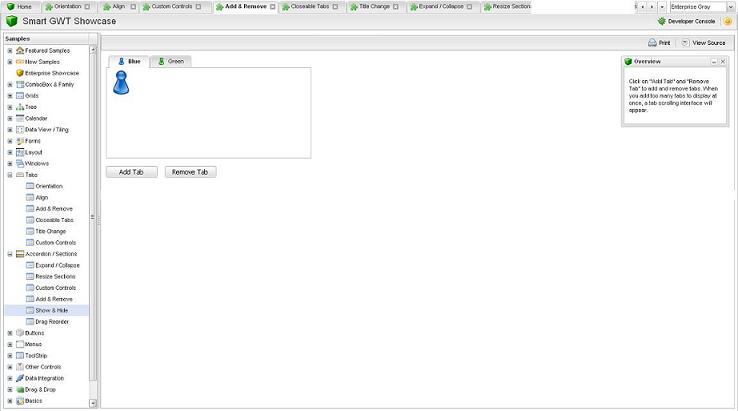 The same general layout should be kept (menu tree on the left, general pane on the right which moves up a bit) but the "tabmenubar" could be moved above the "Smart GWT Showcase" menubar and the alignment of the first tabtitle would be on the far left.
